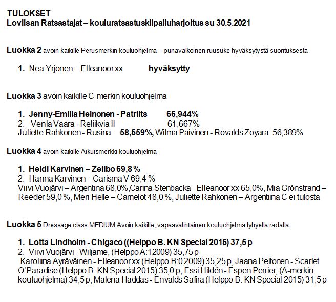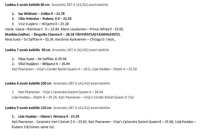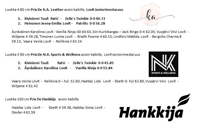 Ann-Charlott Lindholm – Chicago 62.00, Carina Stenbacka – Elleanor LovR 60.20, Malena Haddas – Envalds Safira LovR 59.20, Nina Sund – Sir Saffian LovR 58.60, Isa Grönholm – Windy Day LovR 58.60, Susanne Skogberg – Patriits LovR 58.00, Jessica Papinniemi – Almaa LovR 57.20, Janica Von Veh – Rubens II LovR 56.80, Elina Haggrén-Parpala – Lotta HRS 55.0